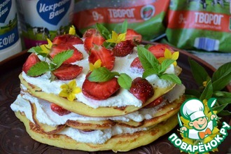 Творога - 120 г, печенья - 20 г, сахара - 15 г, 1/2 яйца, молока - 20 г, масла сливочного- 10 г, сметаны -30 г.