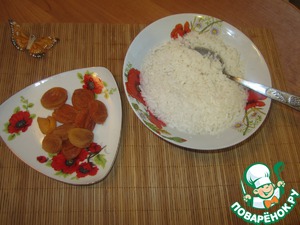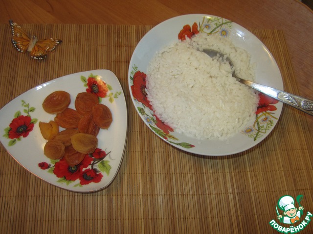 • Для формирования шариков нам понадобиться сваренный рис и курага. Курагу я тщательно промыла и поварила в кипящей воде 5 минут.