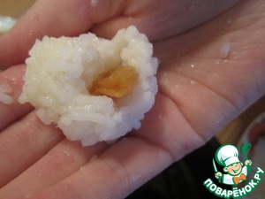 • Скатываем рис в шарик и вкладываем внутрь кусочек кураги.