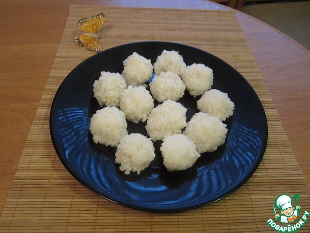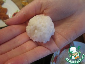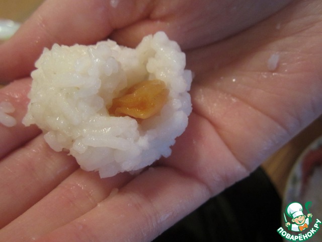 • Формируем вот такой шарик из риса (внутри курага).