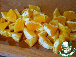 Апельсины очистить, разобрать на дольки, если есть косточки, удалить их. Каждую дольку разрезать на две части.