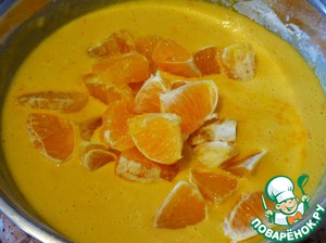 Цедру и апельсины добавить в тесто и аккуратно перемешать.