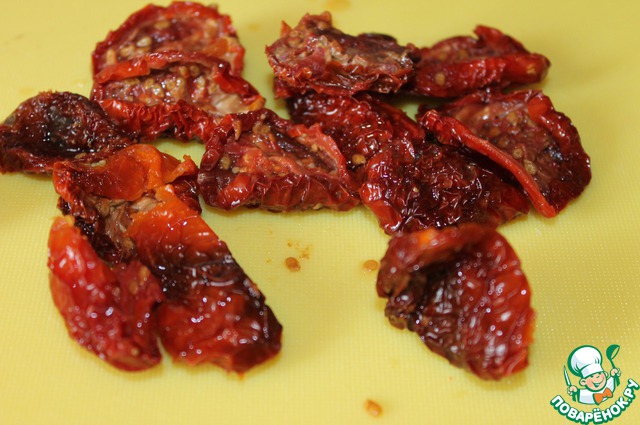 Пока оно у нас поднимается, я залила сушеные помидоры водой. Можно взять и вяленые. Или, вообще, не брать их.