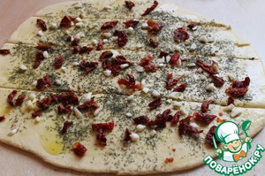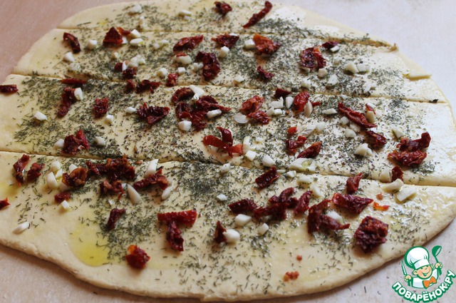 Теперь я обмазала пласт оливковым маслом, примерно 2 ст. л., затем я посыпала сухим укропом и добавила чеснок и помидоры резанные. И разрезаем наш пласт на полоски шириной в 5 см.