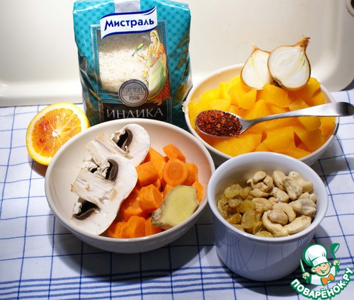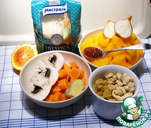 Для овощного рагу нам понадобится: небольшая мисочка тыквы, пара средних морковок, небольшая луковичка, несколько шампиньонов, половинка апельсина, кусочек имбиря размером с грецкий орех, горсть золотого изюма, горсть орехов кешью, пол чайнй ложки сухого перца чили.