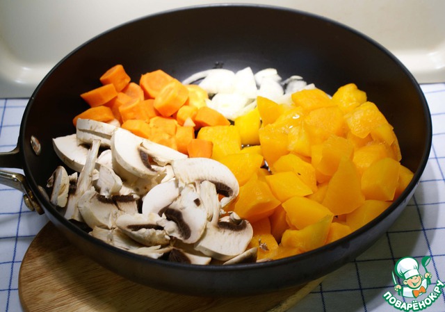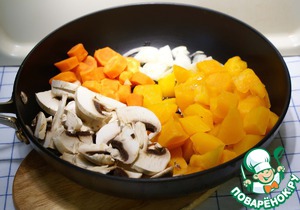 Добавим нарезанные овощи и грибы (лук режем полукольцами, тыкву на ровные кубики, морковь кружочками, грибы пластинками в 5мм толщиной).