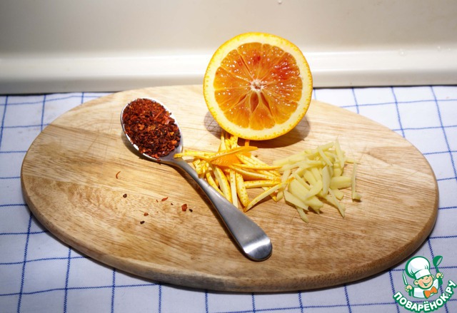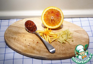 С апельсина срежем цедру и так же нашинкуем тоненькой соломкой.