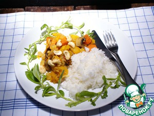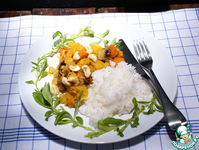 Остро-сладкие овощи с белым рисом и орешками кешью.