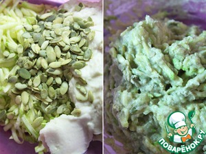 • Для приготовления оладий соединим фасолевую пасту, кабачок и тыквенные семечки, добавим ржаную муку и замешаем тесто.