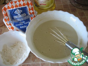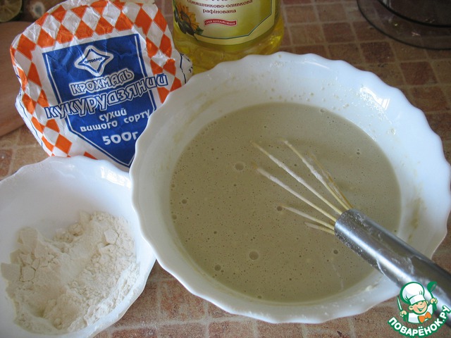 Постепенно добавляем муку, крахмал и растительное масло, замешиваем тесто консистенции очень жидкой сметаны.
