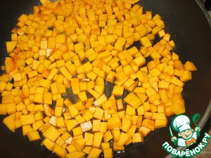 Выкладываем в сироп нарезанную кубиками тыкву и карамелизируем постоянно помешивая 3-5 минут.