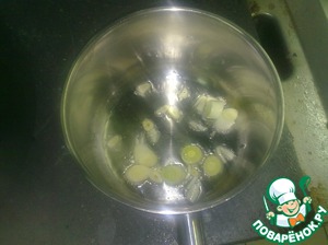 3. В маленькую кастрюльку наливаем масло (5 гр), нагреваем и обжариваем лук и чеснок (10 сек), затем вливаем вино и тушим (10 сек), далее добавляем соевый соус, мирин, воду и имбирь = доводим до кипения