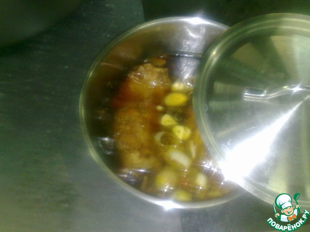 2. Овощи: чеснок нарезаем дольками, лук толстыми кольцами, имбирь просто отжимаем.