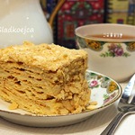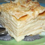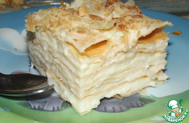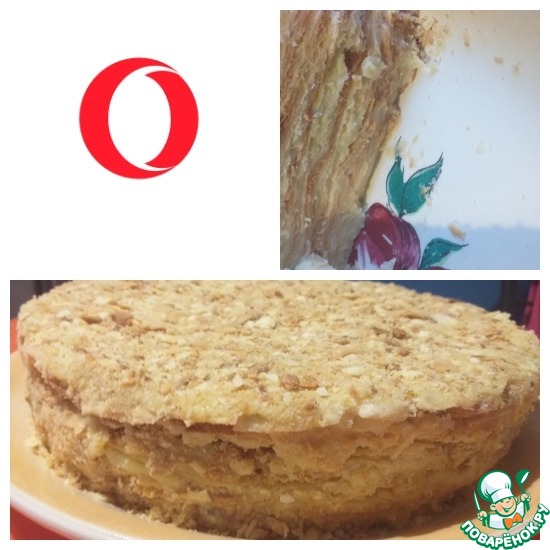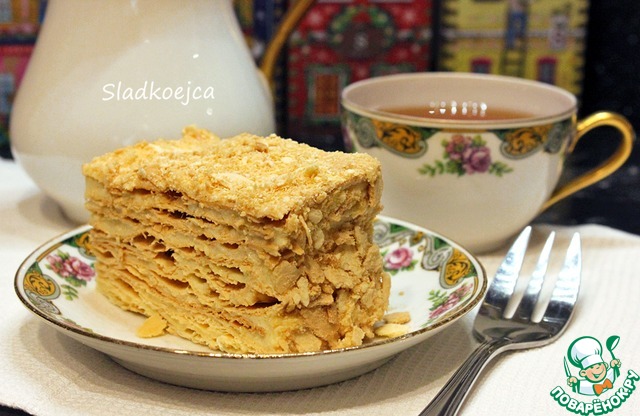 Этот наполеон я бы охарактеризовала многими лестными эпитетами. Он совсем не сухой, но и не слипшийся в единый ком: слоеные коржи ощущаются, но они хорошо пропитанные, мягкие настолько, что торт можно есть вилкой. Сливочного масла минимум - только в коржах, торт получается не переслащенный и легкий для желудка. Рецепт теста взяла в контакте, но в процессе приготовления внеслись некоторые критичные коррективы. Рецепт заварного крема с сайта "готовим дома".