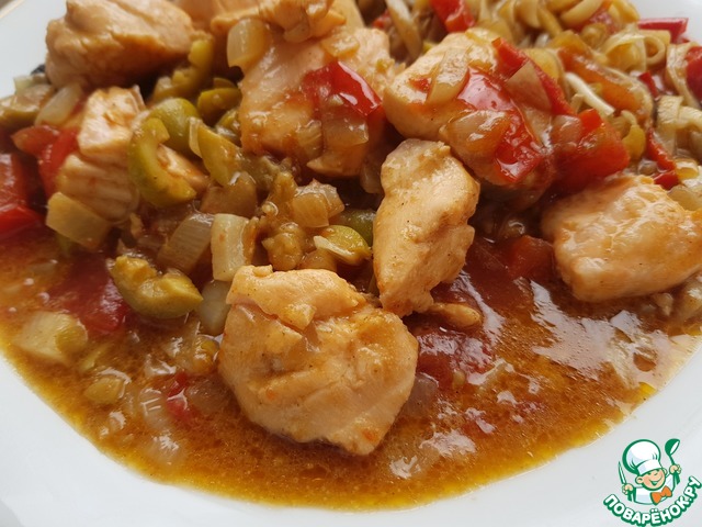 Готовое блюдо выложить на тарелки, украсить порезанными кольцами оливками, посыпать зеленью.