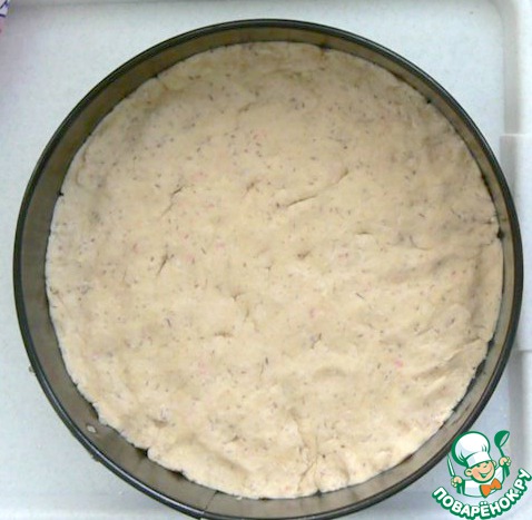 Разогреть духовку до 200г, тесто распределить по дну формы 24см. Выпекать 20-25 минут. Остудить корж и вместе с формой, в которой будем собирать, отправить остывший корж в морозильную камеру. Это нужно, чтобы при заливании начинки слой на корже сразу застыл и не дал тесту сильно впитать жидкость.