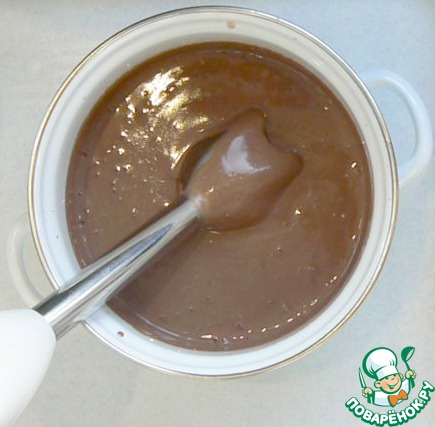 Агар-агар нагреваем на плите до полного растворения, затем в шоколадную массу вводим коньяк, а растворенный горячий агар-агар еще раз все блендером пробиваем. -