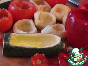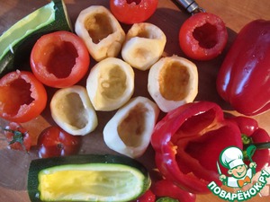 Срезать верхушки и очистить внутренности у перцев и помидоров. От помидоров оставить в сторонку в будущую начинку.