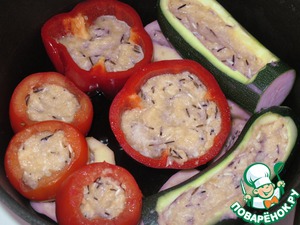 Уложить слоями, первый картофель, затем помидоры, перец, кабачки.
