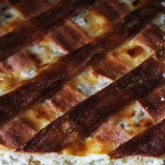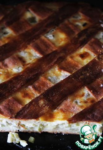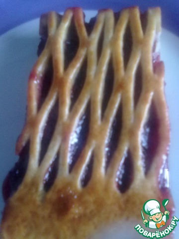 Накрываем этой сеткой, растягивая её, всю поверхность пирога. На счёт защипывания ничего не было сказано - я не защипывала края.