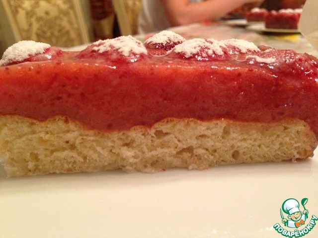 На пласт теста распределяем наш ревень. Сок, образовавшийся от добавления в ревень сахара, сливаем.