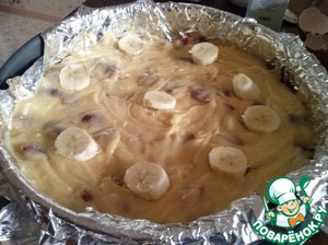 На дно формы высыпаем сливы и равномерно их распределяем. Сверху украшаем бананами и немного посыпаем сахаром. Ставим в духовку на 25 мин. при температуре 175 градусов