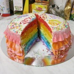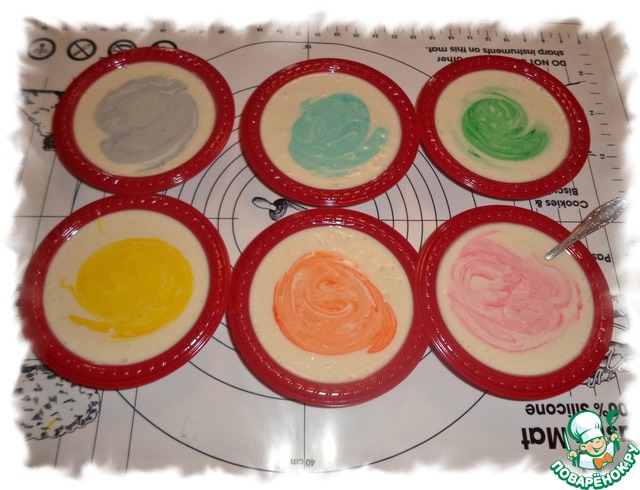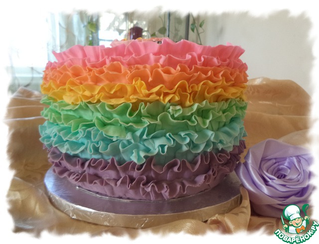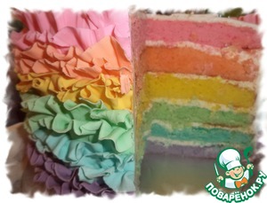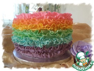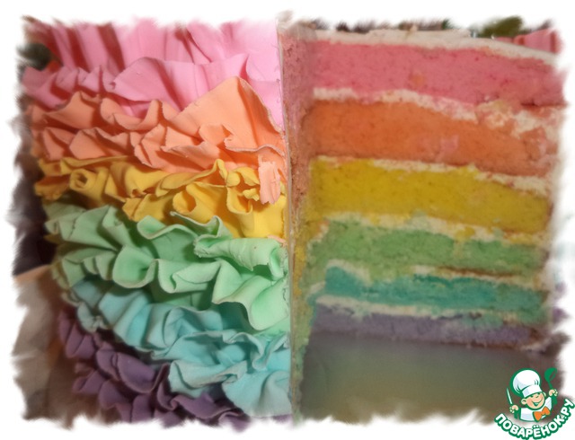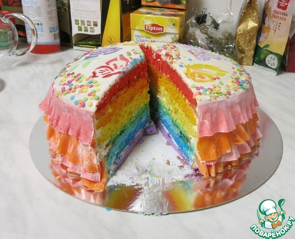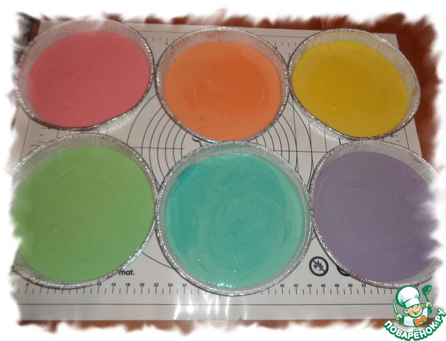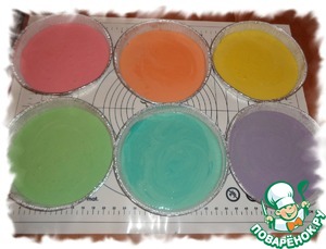 Собираем торт. Укладываем коржи друг на друга, перемазывая кремом в таком порядке: сиреневый, голубой, зелёный, жёлтый, оранжевый, розовый. Отправляем в холодильник на пару часов.