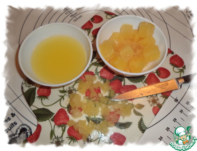 Ананасы отделяем от сиропа. Сироп будем использовать для пропитки коржей. Ананасы режем на маленькие кусочки, которые будут добавлены в крем. Можно использовать любые фрукты или ягоды - как свежие, так и консервированые.
