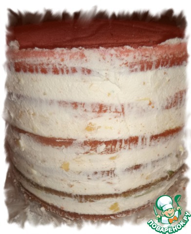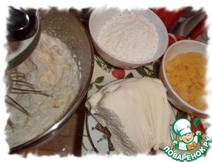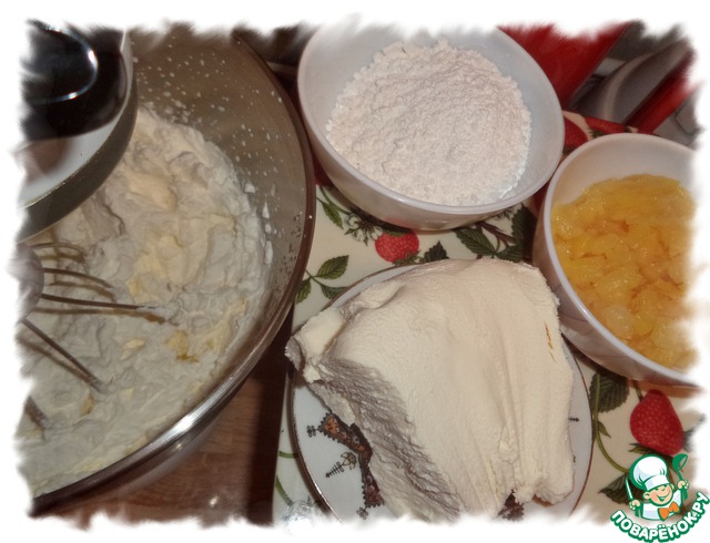 Готовим крем (в принципе, ваш любимый, какой вам больше по душе). 350 мл сливок взбиваем до состояния крема, продолжая взбивать, добавляем 250 гр маскарпоне и 50 гр сахарной пудры и в конце добавляем мелко нарезанные ананасики.