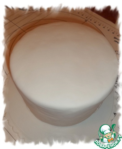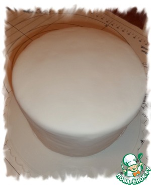 Покрываем торт, разглаживая мастику со всех сторон, излишки отрезаем. Если по бокам мастика ляжет не совсем гладко - это не беда, этого видно не будет, но верx обязательно должен быть гладким.