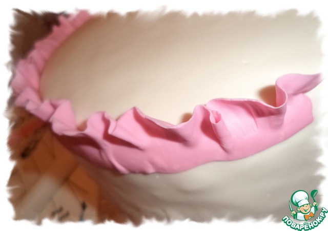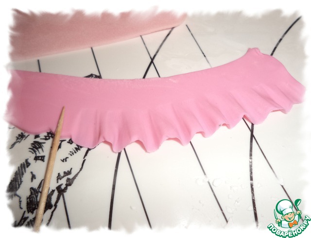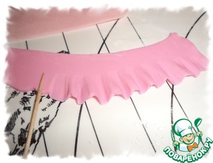 Теперь очередь оборочек. Начнём с розового цвета. Раскатываем розовую мастику, разрезаем на полоски примерно 15 см на 2,5 см. Используя зубочистку, делаем оборочку, прижимая и немного прокатывая верёд-назад нашу палочку. Прокатали - переставили чуть-чуть дальше, опять прокатали и опять переставили, и так до конца полоски; более подробно, как делать оборочку, можно посмотреть здесь: http://www.pov arenok.ru/recipes/sh ow/74506/