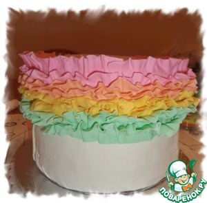 Начинаем приклеивать оборочки сверху. Кисточкой, смоченной в воде, промазываем сбоку торт. Слегка присобирая уже готовую оборочку, приклеиваем её к торту, немного прижимая. Kогда заканчивается одна полоска, делаем следующую, приклеиваем её, и так по всей окружности торта. Делаем по два ряда на каждый цвет.