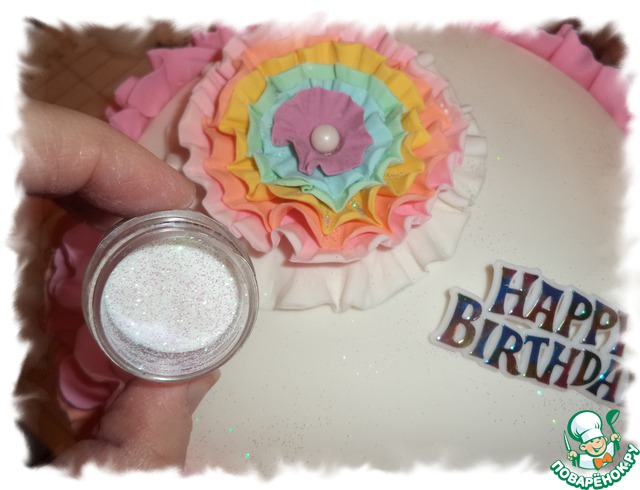 Надпись "Happy birthday" - это единственный несъедобный момент, очень кстати обнаруженный мной в закромах. И чтобы было ещё праздничнее, решила присыпать съедобными блёсточками. -