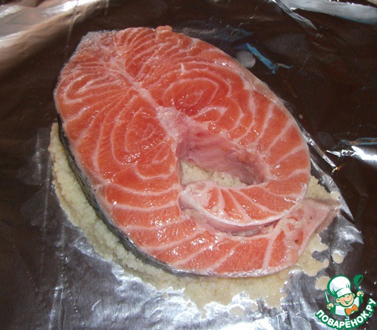 Отрезаем фольгу нужного размера, чтобы хватило завернуть стейк, слегка смазываем её центр растительным маслом и выкладываем в середину половину кускуса. На кускус кладём форель.