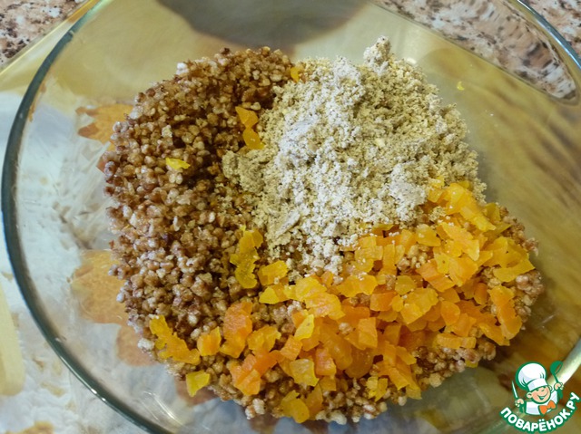 • Когда шоколад полностью растает, вмешиваем в него воздушную гречку, мелко нарезанную курагу, жареный молотый грецкий орех. Полученную массу выкладываем в любую форму и убираем в холодильник на часок. Так как форм под конфетки у меня не оказалось, то пришлось импровизировать и заливать остывшую полученную смесь в форму из-под конфет