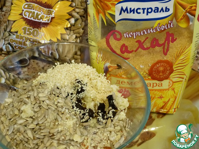 • Готовим козинаки: в миску выкладываем воздушный рис, мелко нарезанный чернослив, жареные семечки, кунжут.