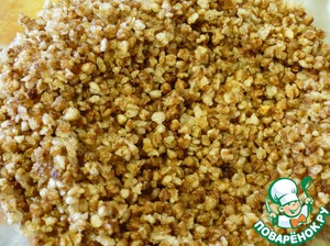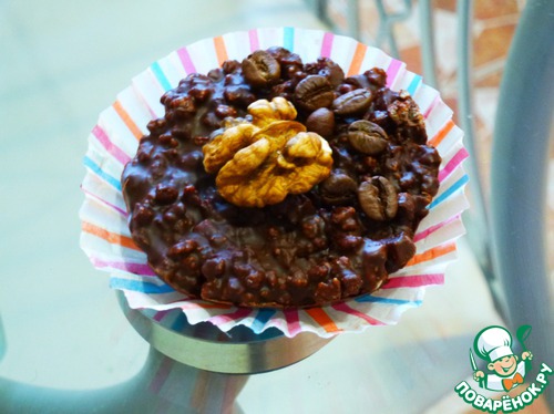 Когда шоколад полностью растает, вмешиваем в него воздушную гречку, мелко нарезанную курагу, жареный молотый грецкий орех. Полученную массу выкладываем в любую форму и убираем в холодильник на часок. Так как форм под конфетки у меня не оказалось, то пришлось импровизировать и заливать остывшую полученную смесь в форму из-под конфет