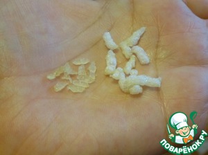 Рис подсушенный и уже готовый - для сравнения. Не обольщайтесь, крупа сильно не увеличится и совсем не похожа на магазинный воздушный рис. Но получается очень воздушный и хрустящий, прям тает на языке.