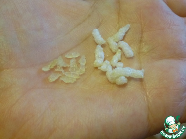 • Рис подсушенный и уже готовый - для сравнения. Не обольщайтесь, крупа сильно не увеличится и совсем не похожа на магазинный воздушный рис. Но получается очень воздушный и хрустящий, прям тает на языке.