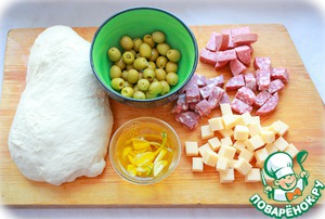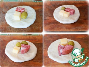 В кусочки теста заворачиваем начинку. Кладём оливку, сыр и кусочки колбасы, комбинируем в произвольном порядке.