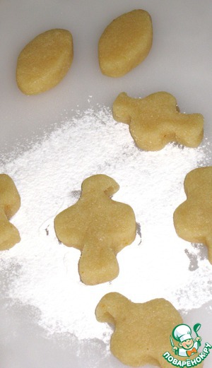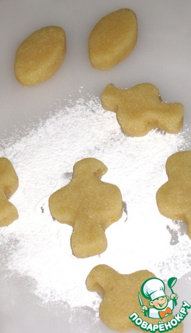 Посыпьте немного рабочую поверхность смесью крахмала (либо рисовой муки) и сахарной пудры и разделите тесто на кусочки - 20-25 грамм. Придайте им стилизованную форму голубок.