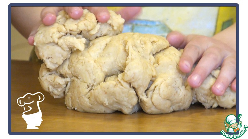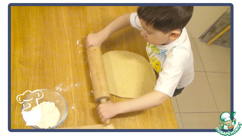 3) Разделите тесто на 2 части и раскатайте их на противень. Обрежьте лишнее тесто по краям. -