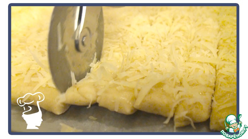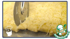 4) Разбейте яйцо и смажьте им тесто. Рассыпьте сыр и разрежьте тесто на тонкие полоски.
