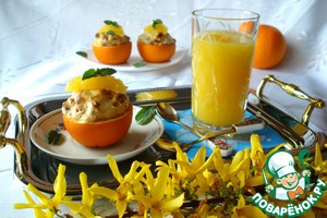 Готовый десерт украшаем дольками апельсина, листочками мяты и подаём тёплым со свежевыжатым апельсиновым соком.