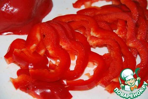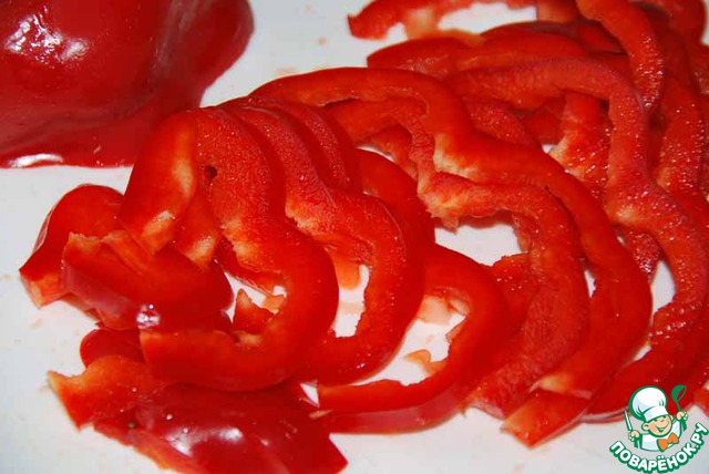Болгарский перец нарезаем тонкими полосками. -