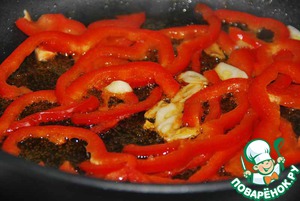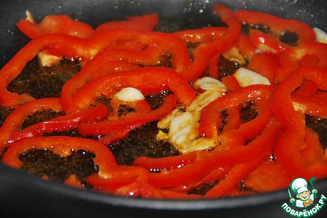 На раскалённой сковороде (лучше это делать в воке, если он у вас есть) на растительном масле обжариваем нарезанный болгарский перец 1 минуту, добавляем чеснок и обжариваем ещё 1 минуту.