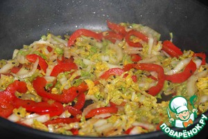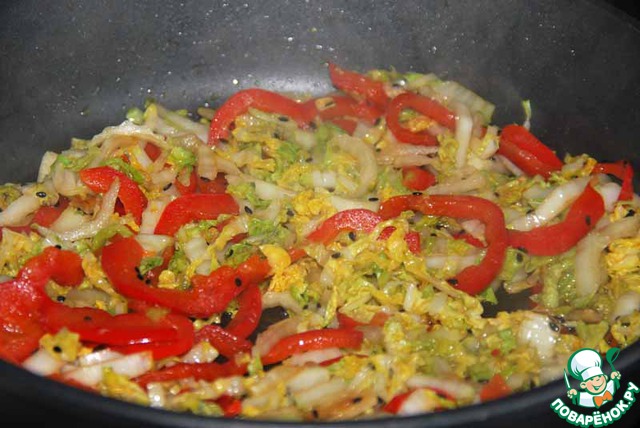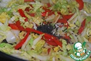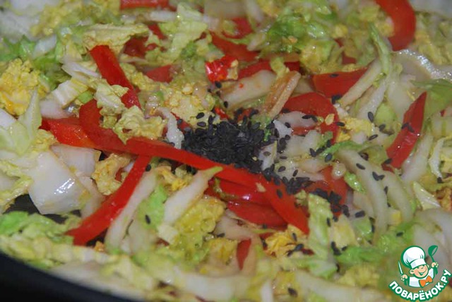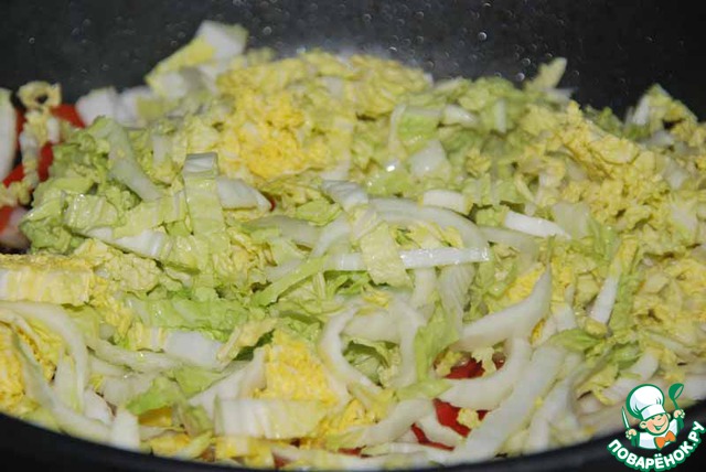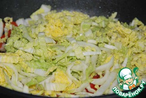Пекинскую капусту нарезаем тонкими полосками и добавляем к обжаренному перцу с чесноком.