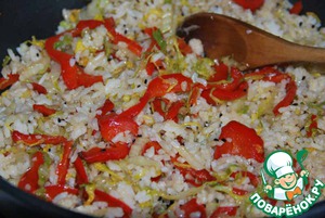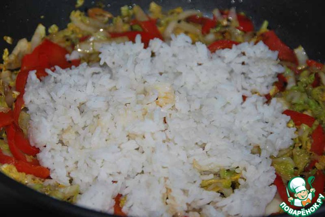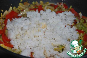 Готовый сваренный рис слегка рыхлим и добавляем к овощам.
