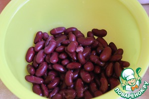 Для начинки я взяла фасоль фирмы Мистраль, темную. Я ее замочила на ночь, а утром отварила.