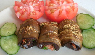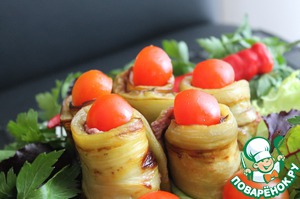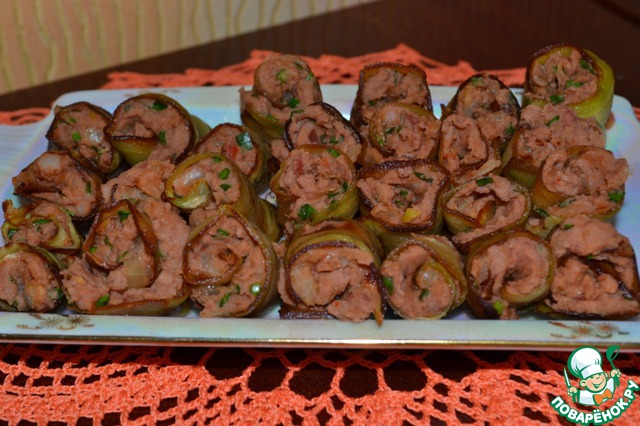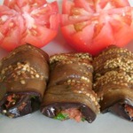 [+5]Пластины баклажанов чуть-чуть разморозила и поджарила. Намазала начинку и свернула рулетик. Всё! Быстро и вкусно!